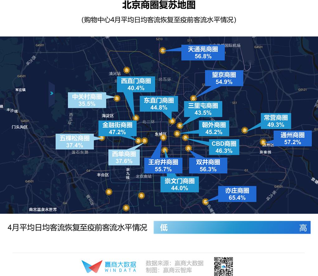 “三环外”人口相对分散,“扎堆消费”顾虑较轻,消费者恢复正常生活节奏后,望京、通州、亦庄、天通苑等区域商圈复苏较快;而高新技术及互联网企业和高校集中的中关村商圈,则因未完全复工复学影响客流恢复。