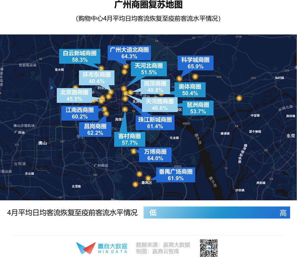 此外,万博商圈、番禺广场商圈、江南西商圈等区域商圈,主要辐射周边客群,客流恢复6成以上;处于4月聚集性传染疫情“漩涡中心”的环市东路商圈,客流复苏则受阻明显。