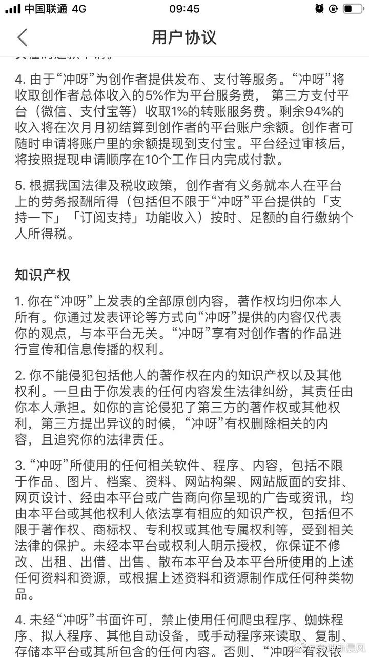 微博博主 @ 安迪斯晨风 在事件发酵后就在微博安利其他平台,表示「想告诉大家,一个正常的网络作品发布平台应该是什么样的。」这个叫做「冲呀」的平台仅收取作者的 5% 收入作为平台服务费,对第三方支付收取 1% 为转账服务费,94% 收入将在次月月初进入作者账户,用户协定也明确指出,著作权均归本人所有。