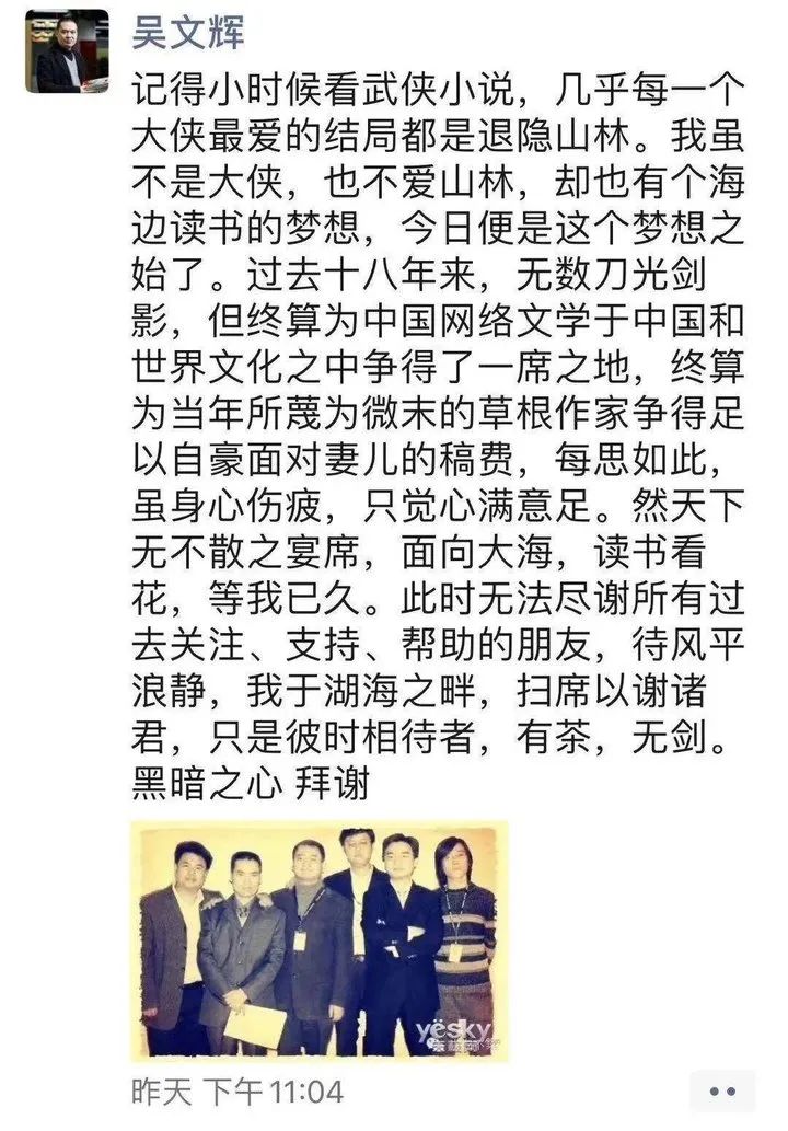 4 月 28 日,阅文集团前 CEO 吴文辉在朋友圈和自己供职多年的阅文完成了告别。而就在前一天,阅文集团宣布了管理团队的调整,原高管吴文辉、梁晓东、商学松、林庭锋集体辞任,走马上任的则是腾讯集团副总裁程武。