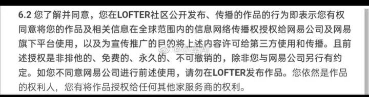 在 AO3 事件中被更多人所知的网易 Lofter 被大家亲切地称为「老福特」。在 AO3 事件中,也有不少人号召大家「保护我方老福特」。但在这次的阅文纠纷中,Lofter 同样站在了作者的对立面,在他们的用户协定中「授权是非排他的、免费的、永久的、不可撤销的」。