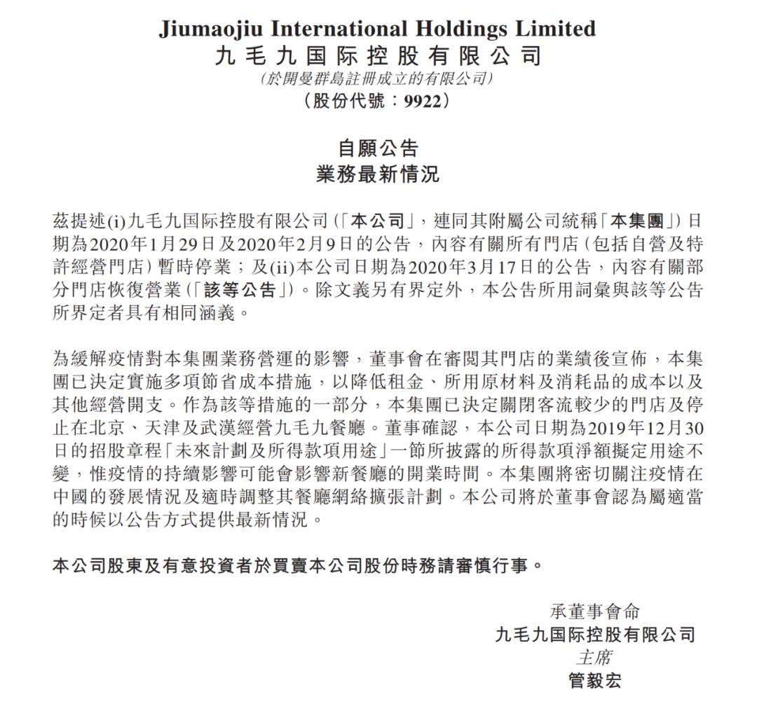 公告称,为缓解疫情对其集团业务营运的影响,九毛九已决定实施多项节省成本措施,以降低租金、所用原材料及消耗品的成本以及其他经营开支。而关闭客流较少的门店及停止在北京、天津及武汉经营九毛九餐厅,是其节省成本措施的一部分。