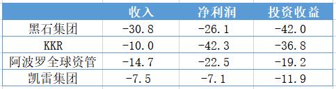 此外,阿波罗全球资管、凯雷等美国上市PE,也录得了金额庞大的亏损,总收入、净利润、投资收益等各项指标没有一个是正数。其中,四大PE投资收益合计亏损109.9亿美元(超700亿人民币)。