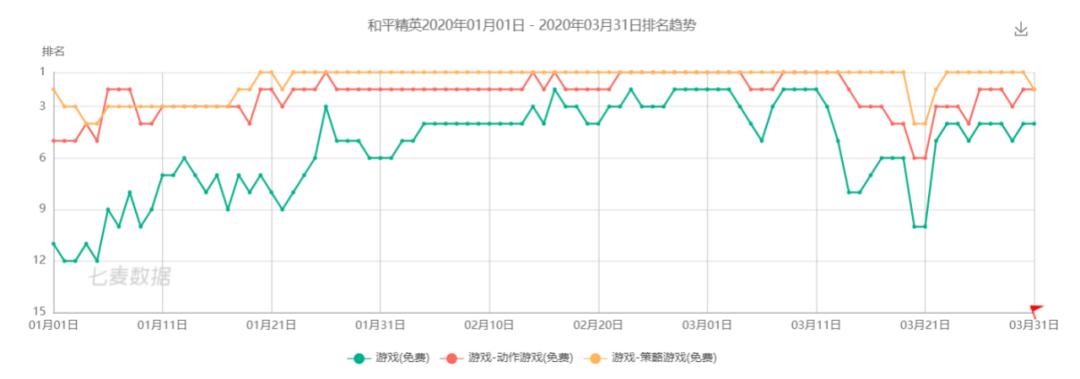 从2020年第一季度分月份来看,《和平精英》1月大部分时间排名在前十名;而在2月IOS畅销榜中,《和平精英》基本稳定在前五之列;3月IOS畅销榜中,该作同样未跌出前十名的行列。