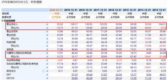 2020年,突如其来的新冠疫情,对于泸州老窖的中低端酒销售冲击不小。一季度,泸州老窖营收35.52亿元,同比下滑14.79%,归母净利润为17.07亿元,同比反而增长12.72%。