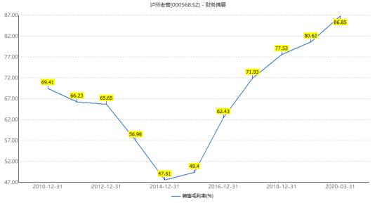 综合毛利率方面,2020年一季度已经高达86.85%,比2014年高出39%,主要原因是高端白酒——国窖的放量以及提价。另外,一季度净利率为48.59%,同比提升11.31%,环比4季度末提升19.24%。