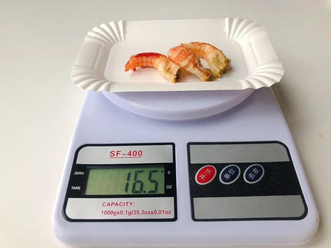 抽出3只称重,再剥开称出纯虾肉的重量——