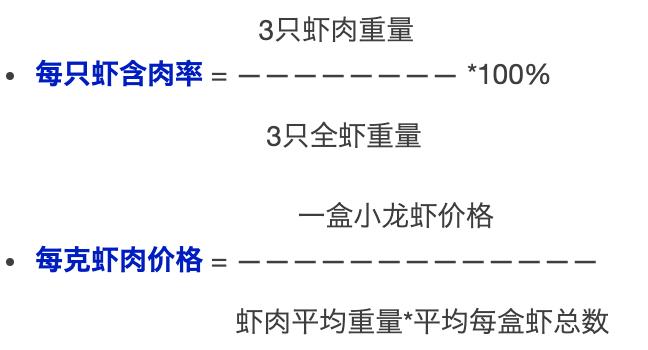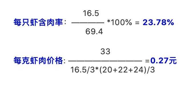 经过超妹严格的清点和体育老师亲传的数学功底,计算出每日优鲜爆料麻小每只虾的「含肉率」和每克虾肉价格。使用公式如下: