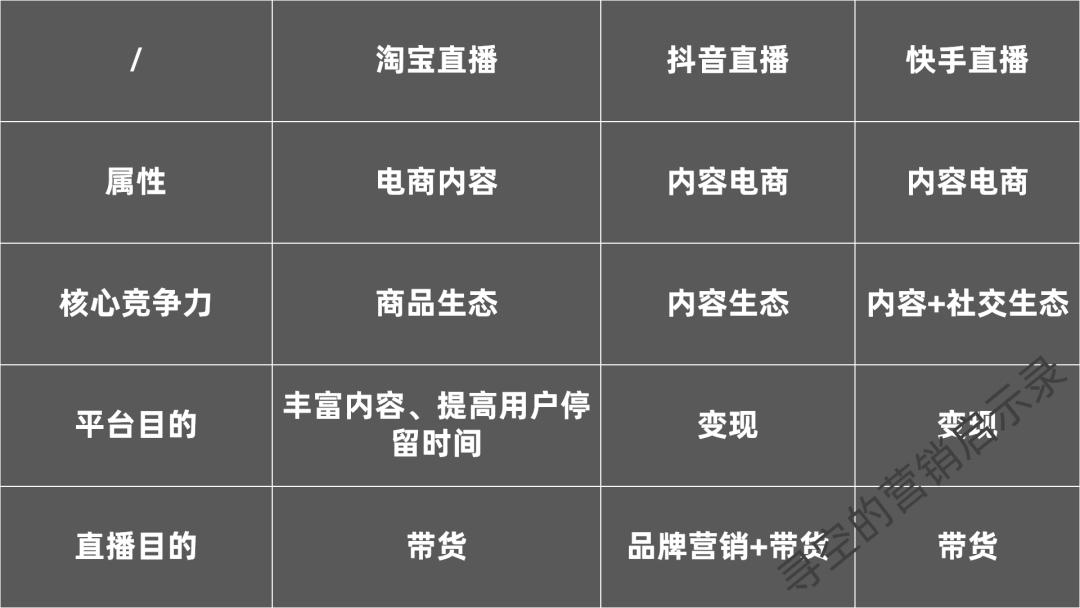 首先来谈一谈直播电商的三大巨头,淘宝直播、抖音直播和快手直播。经常有人问三者直播电商的区别是什么,我觉得用一句话就可以概括:抖音、快手是内容电商,淘宝是电商内容。