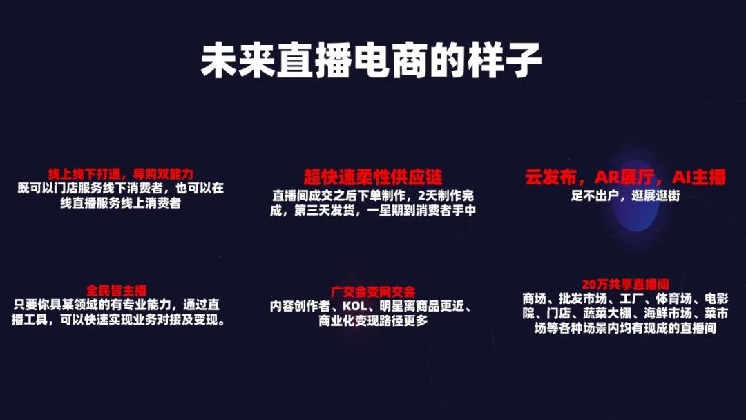 随着5G的来临,直播将可能成为基础设施,下图是赵圆圆在一次分享中提到“未来直播电商的样子”,可以看到直播带货只是其中一个小角色,云发布、广交会、共享直播间都是更广义的直播带品牌。