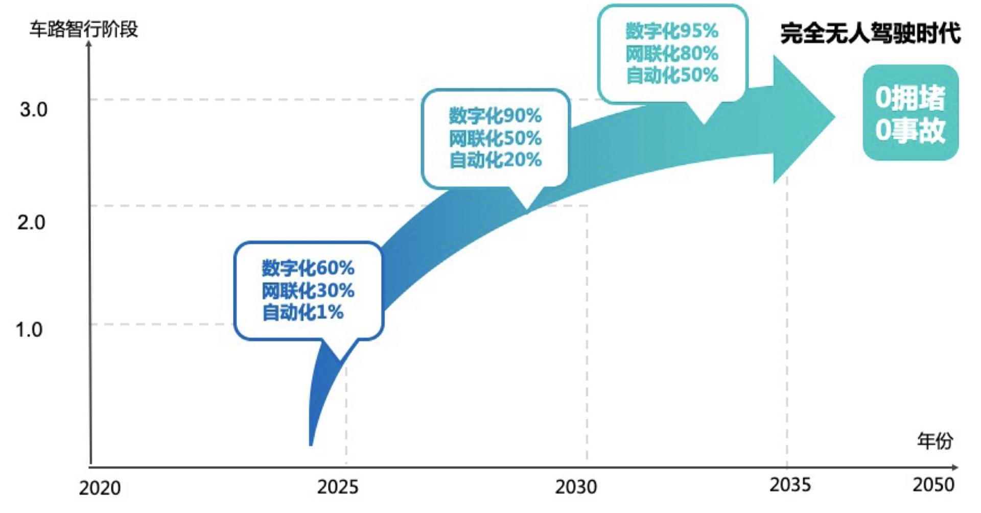到2035年,车路智行完成网联化转型,高级别自动驾驶车辆实现大规模商用,新型交通信息基础设施基本实现全域覆盖。到本世纪中叶,车路智行完成自动化变革。