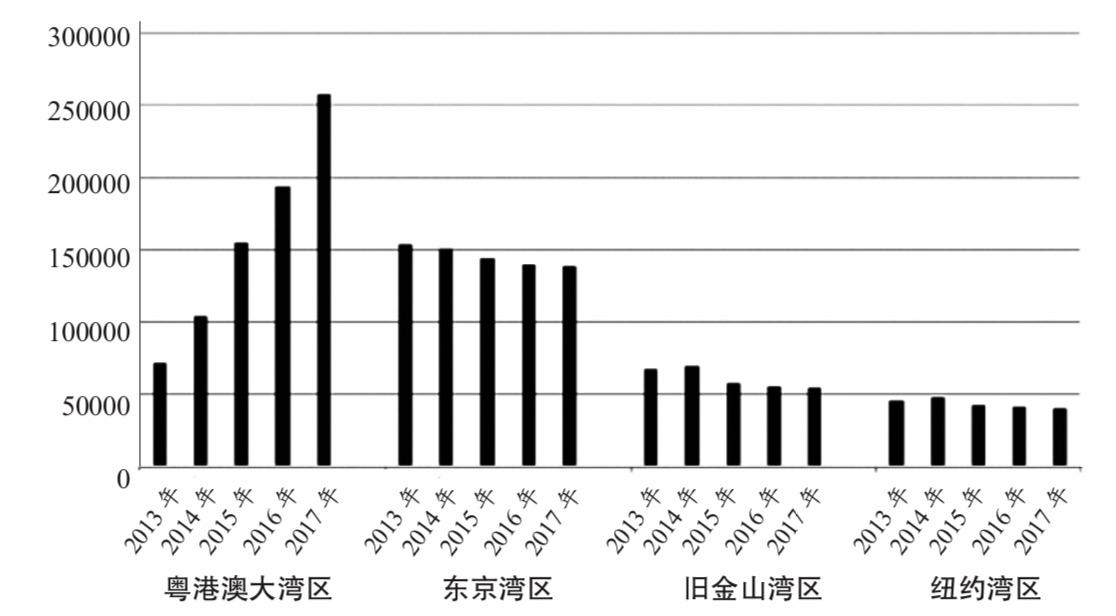 世界四大湾区发明专利总量对比 来源:中山大学“粤港澳大湾区”专题研究