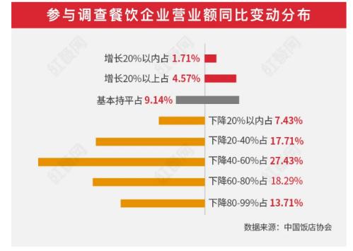 在这一份调查中,仅透露出两点好消息,一是餐饮企业复市率达到85.37%,市场正在逐步恢复正常经营;二是参与调查的餐饮企业营业额平均恢复至同期的56.86%,客流量达到上年同期的60.45%,同样说明了市场正在在逐步回暖。