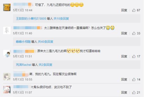 这不,随着九毛九“关闭京津汉22家门店”消息传来,这一话题又在在微博上掀起了一场声势浩大的讨论。有网友单纯地表示自己的惋惜“可惜了,九毛九还挺好吃的”,也有网友借九毛九的关店指出疫情对餐饮业的影响——“疫情对于餐饮业的打击,实在太大了”。