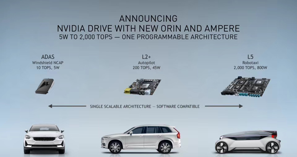 不再是单纯的算力叠加游戏。英伟达借助全新的安培GPU和即将推出Orin系统级芯片(SoC),对DRIVE AGX平台进行扩展,为自动驾驶行业提供了一套灵活可扩展方案。“既可以为前挡风玻璃提供5瓦的ADAS系统,还能将规模扩大到L5级Robotaxi系统。”