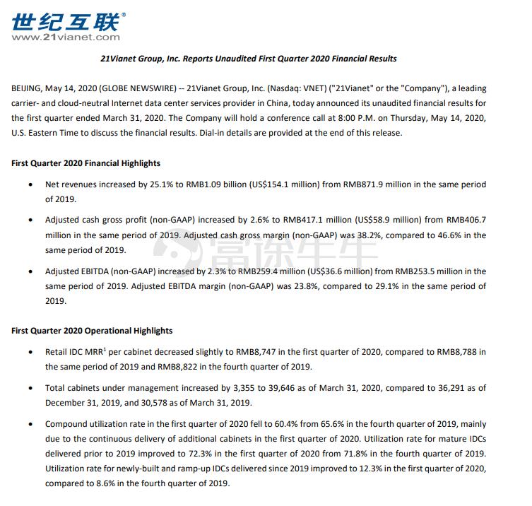 美东时间周四(5月14日)美股盘后,世纪互联(VNET.US)公布2020年第一季度财务报告。