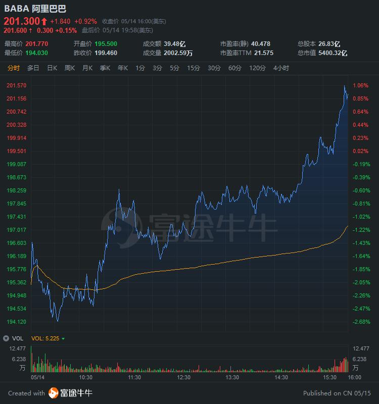 截至周四收盘,阿里巴巴收涨0.92%,报201.3美元,总市值5400亿美元。
