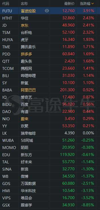 涨幅较大的有:富途控股涨3.91%,房多多涨15.25%,朴新教育涨8.09%,猎豹移动的涨5.82%,世纪互联涨1.07%。
