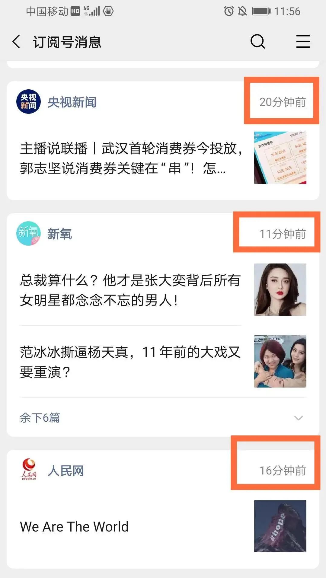 比如下面这张图,央视新闻20分钟前的信息推送,却排在了16分钟前推送的人民网前面。