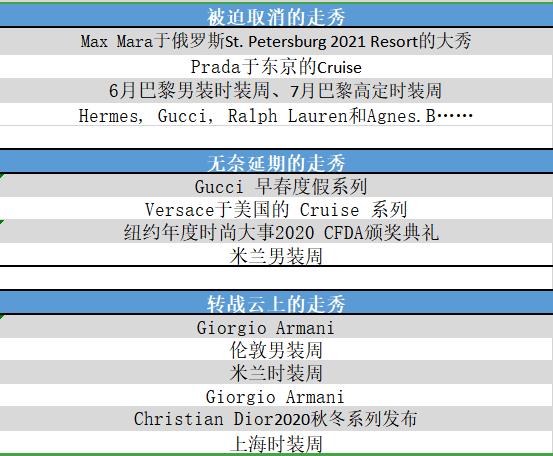意大利时装商也宣布,原定于6月举行的米兰男装周推迟,将合并至2020年9月的女装周之中。爱马仕、Gucci、Ralph Lauren等品牌更是早早便选择了取消走秀……