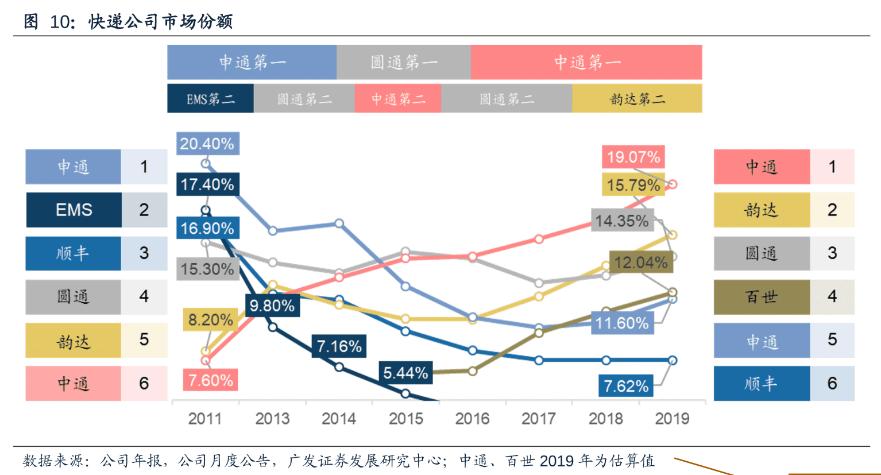2019年,申通快递、韵达股份、圆通速递、顺丰控股业务量市场份额达到11.60%、15.79%、14.35%、7.62%。对比这些快递公司2011年的数据,投中网发现,快递江湖的座次早已变天。