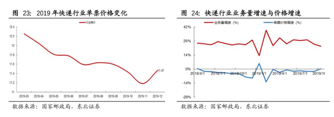 从上图我们可以看到,价格魔咒操纵着行业格局:2019年,快递行业的单票价格大部分时间处于下滑状态,而业务量增速和价格增速呈负相关,快递价格下降,市场份额上升。
