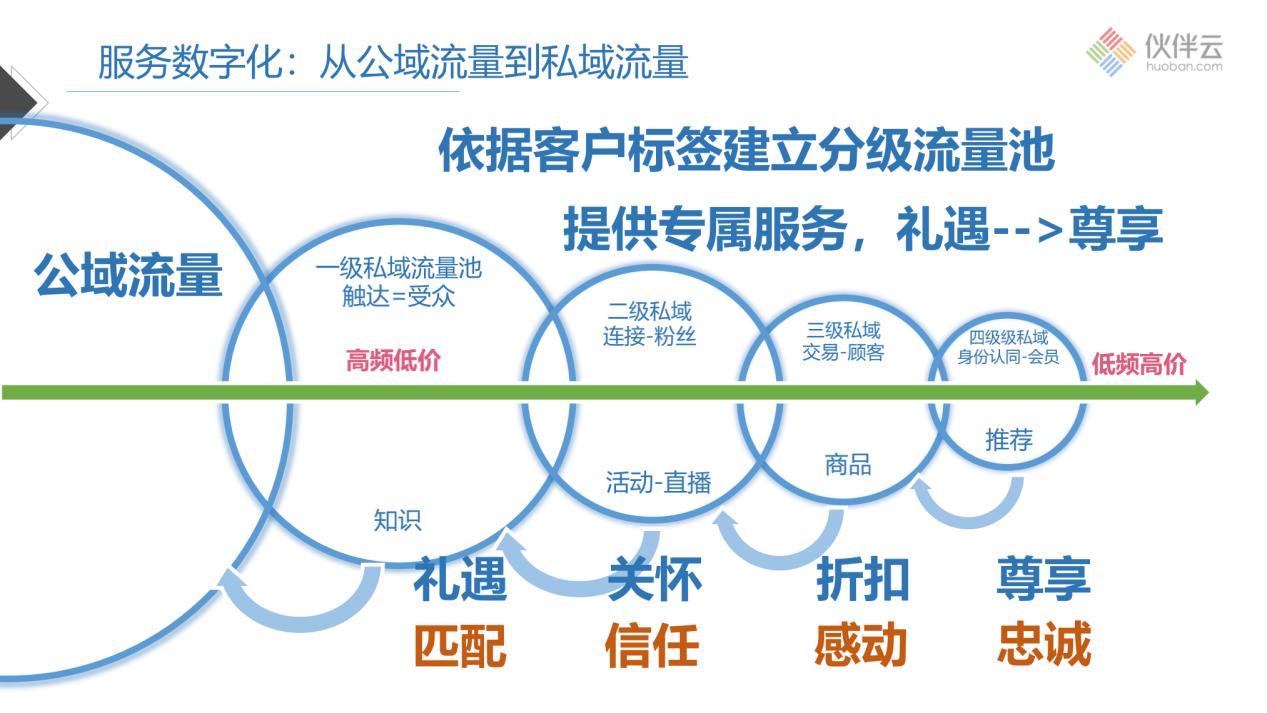 再比如,这个客户是张三服务的,可能张三都离职了,李四再接着去服务,它的客户资料有没有留存下来,现在企业微信和伙伴云都提供了这样的用户转移的能力,将客户资产真正沉淀到企业里,这样的私域流量的模型,其实没有数字化系统就已经完全做不到了。我们需要给客户关怀,什么样的客户给什么样的关怀,如果没有数字化的体系,我们是做不了的。
