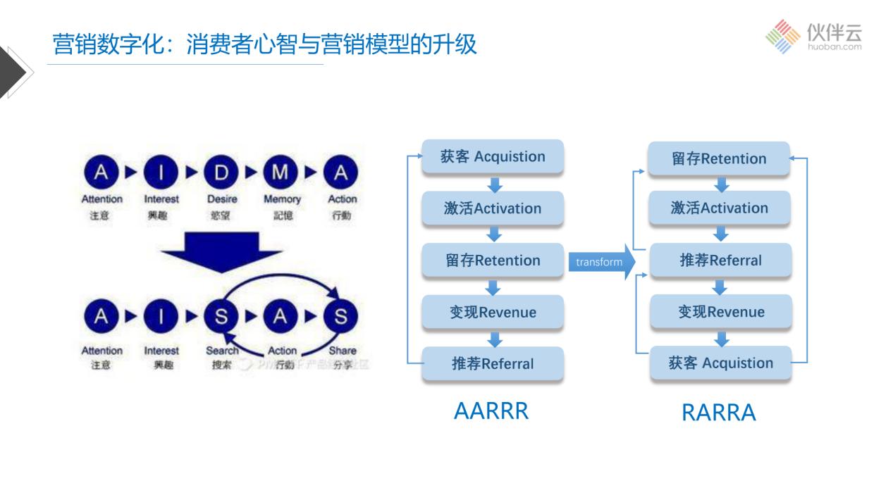 我们以前的营销都是这种非常简单粗暴式的,轰炸人的脑容量。后来在增长黑客的理论里出现了AARRR模型,从获客、激活、留存、变现再到推荐。后来流量成本高起了之后,又出现了RARRA的模型,就是说不管用户买不买你的东西,你先用内容、用引流产品让他留存下来,然后再进行后续的服务。比如说大家听梁老师的课,不管你花钱买了没,你先听两节留下来,看看讲得怎么样。后续梁老师在课里就可以去激活这个客户,你再去邀请两个朋友一起拼团。本质就是,我们先将低用户的决策成本,把客户留下来,然后再一步一步地去提升他的附加价值,所以RARRA的模型其实是相当于真正把消费者当做一个“人”来看。