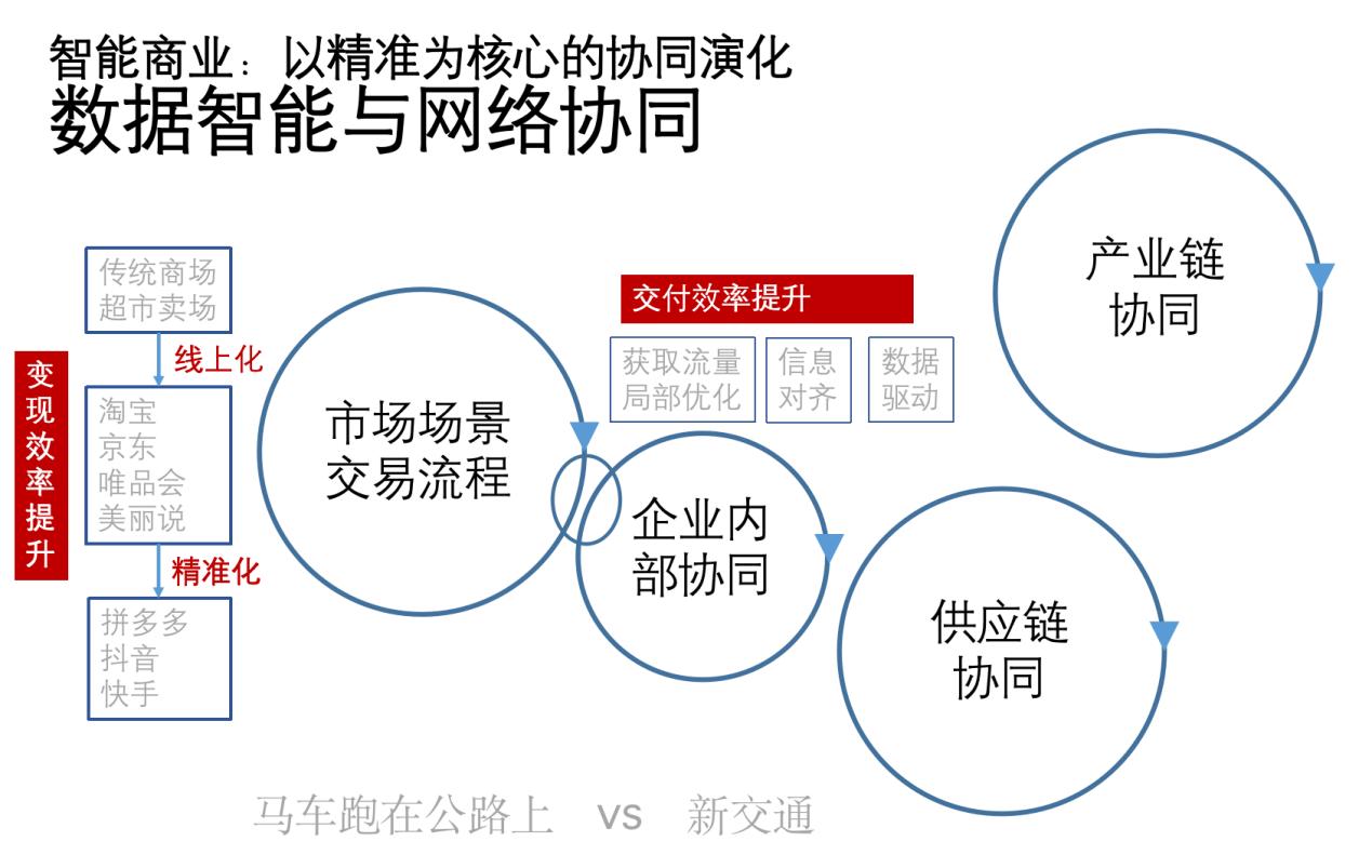 我先交付一个思考框架,所有的商业变革要么是商业驱动,要么就是技术驱动。而今天我们看到市场场景的这一端在发生变化,比如说传统卖场、超市卖场通过实现线上化,变成了淘宝、京东、唯品会、美丽说;拼多多、快手、抖音是一个精准化的过程,在这个过程中可以看到变现的效率在不断提升。