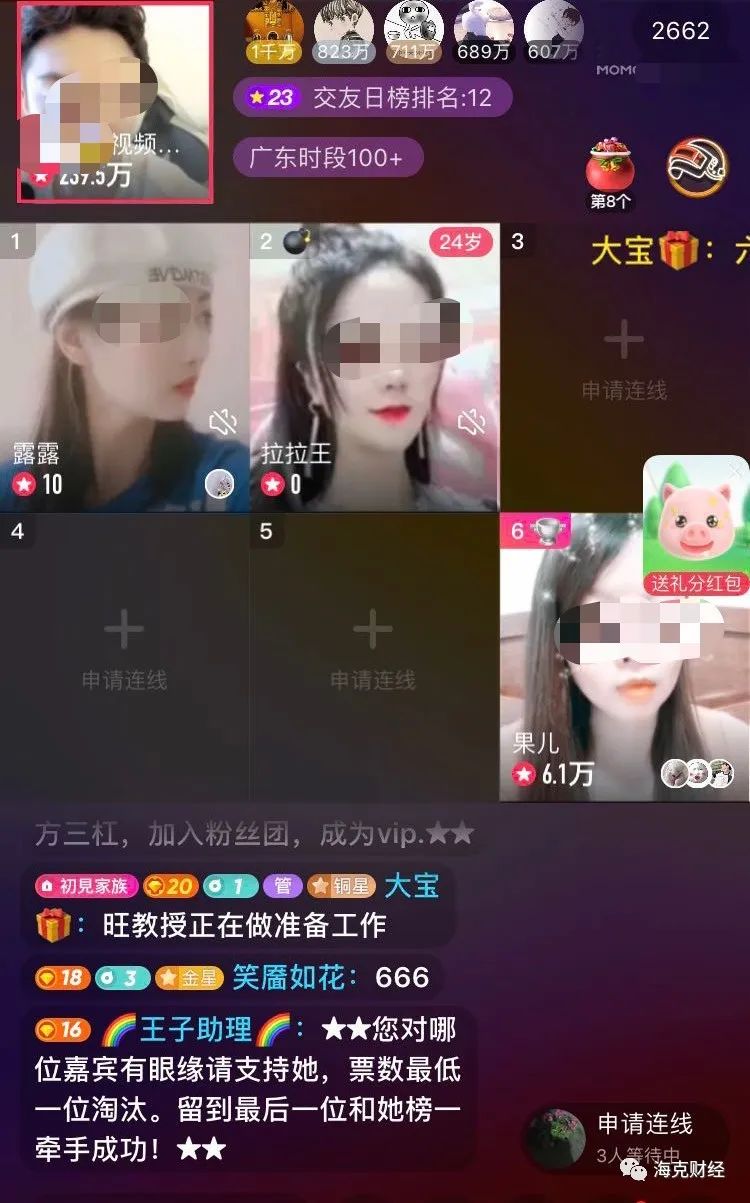 陌陌视频聊室天,是个类似相亲舞台一样的虚拟空间,等你进入时,线上往往已经坐了几位女嘉宾,无一例外年轻靓丽,如果只提供图片的话,那也都是美女图。最忙的是主持人,不断鼓动进场的男嘉宾该对心仪的女嘉宾表示支持,而最基本的支持方式是,先刷个礼物,以获得和女嘉宾互相关注ID的机会。