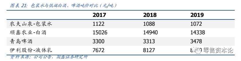 2019 年农夫山泉包装水吨价为1072 元/吨,远低于其他饮料品类,但包装水业务的毛利率水平高达60.2%,与茶饮料接近,高于其他饮料品类。