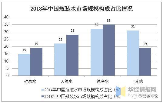 从瓶装水的市场结构来看,矿泉水占瓶装水总体营收比重稳步提升,从2014年的15%提升至2018年的19%,可见随着消费升级,国民饮水需求亦处于升级阶段,矿泉水凭借自身健康属性强和产品差异化策略正在获取更多的市场认可。