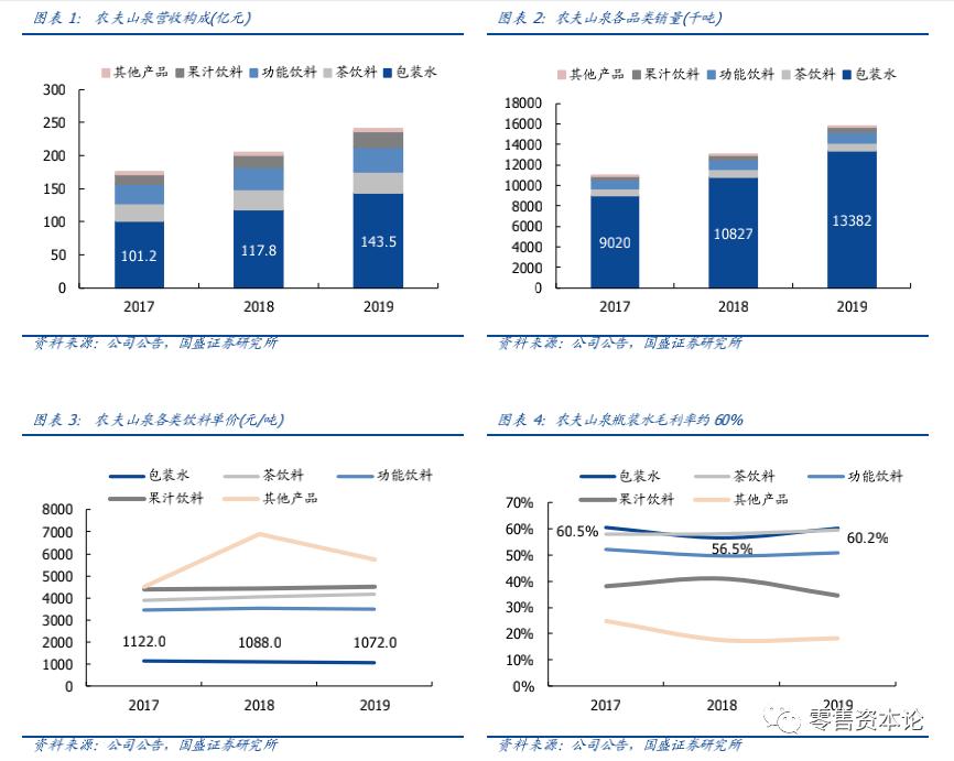 农夫山泉是国内包装饮用水及饮料龙头企业,包装水占公司整体营收、销量的比重分别为60%、85%。