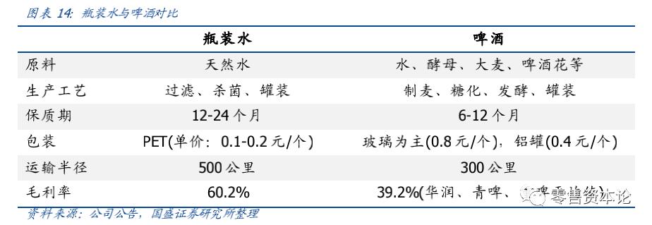 饮料品类中,瓶装水与啤酒较为接近,均为具有运输半径的且相对重资产的大众饮品。