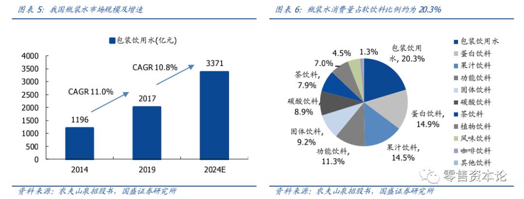 2)我国瓶装水行业集中度 CR 6 为 82.5%,处于两超多强局面,头部企业均有较强的渠道和资本实力。