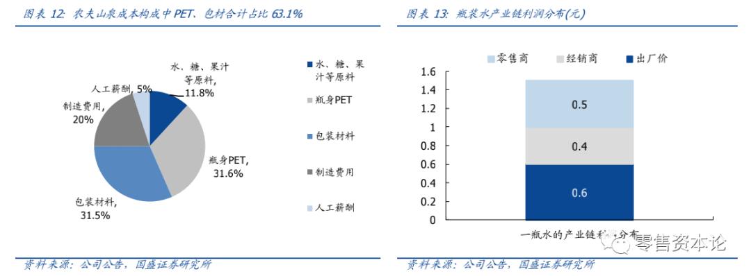 从成本构成来看,水、糖、果汁等原料占比仅为11.8%,瓶身PET、包装材料合计占比63.1%,制造费用及人工占比25%。
