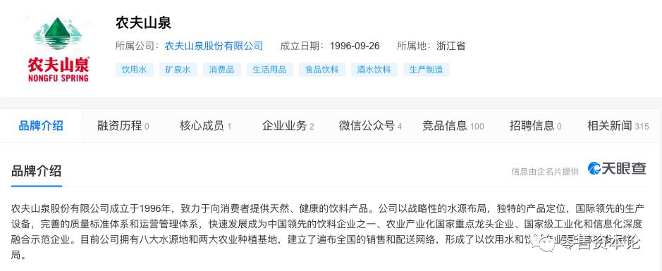 天眼查数据显示,农夫山泉股份有限公司成立于1996年,致力于向消费者提供天然、健康的饮料产品。