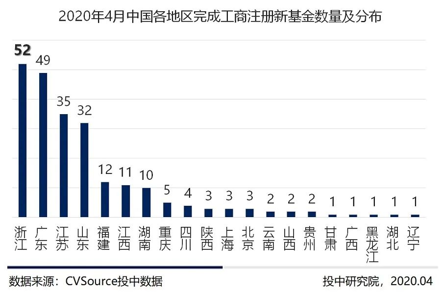 从全国各地区来看,全国更多省市区的VC/PE募资市场开始复苏,其中20个省市完成了新基金的设立,其中浙江省新成立52支基金位列全国第一位。