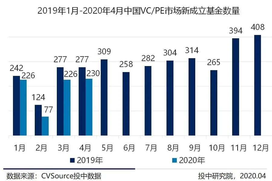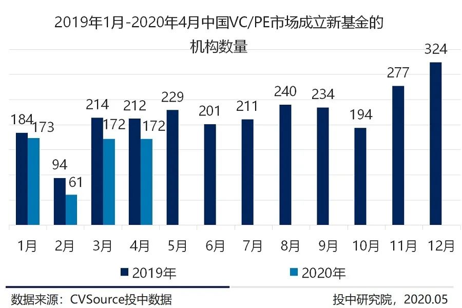 中国开始进入后疫情时代,曾经受疫情影响停滞或推迟募资活动的VC/PE机构,3-4月份机构募资活跃度回升,3、4月均有172家机构成立新基金,虽不及2019年同期水平,但与2月相较增加182%。