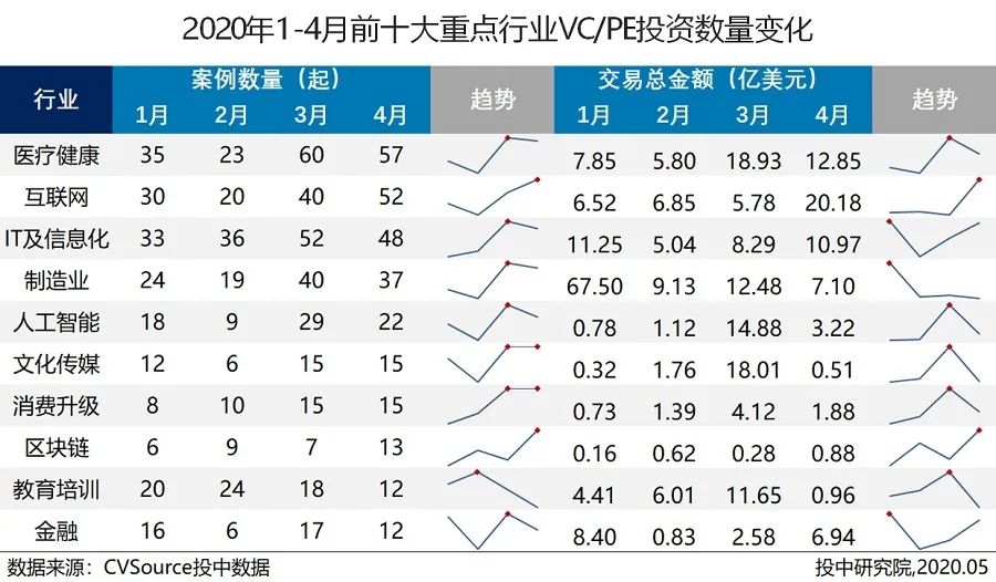 ·随着疫情压力逐步缓解,各行业的VC/PE投资逐步开展,多数行业于3-4月份有明显的提升趋势;
