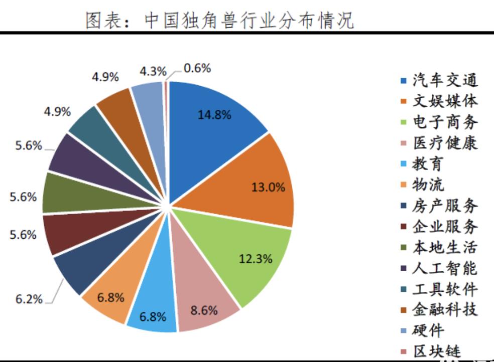 2019年中国独角兽报告中显示的前三行业为:文娱媒体、汽车交通和电子商务,它们分别拥有25家、23家和17家,三个行业代表企业依次为估值750亿美元的今日头条、估值为450亿美元的滴滴出行、估值为30亿美元的小红书。