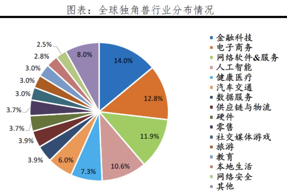 但是在世界范围内,金融科技行业中的独角兽数量位居第一,较2019年上升2.1%。电子商务和网络软件与服务领域独角兽位居其次,人工智能与医疗健康两大领域独角兽数量较去年增长速度较快,汽车交通行业仅占比6%。