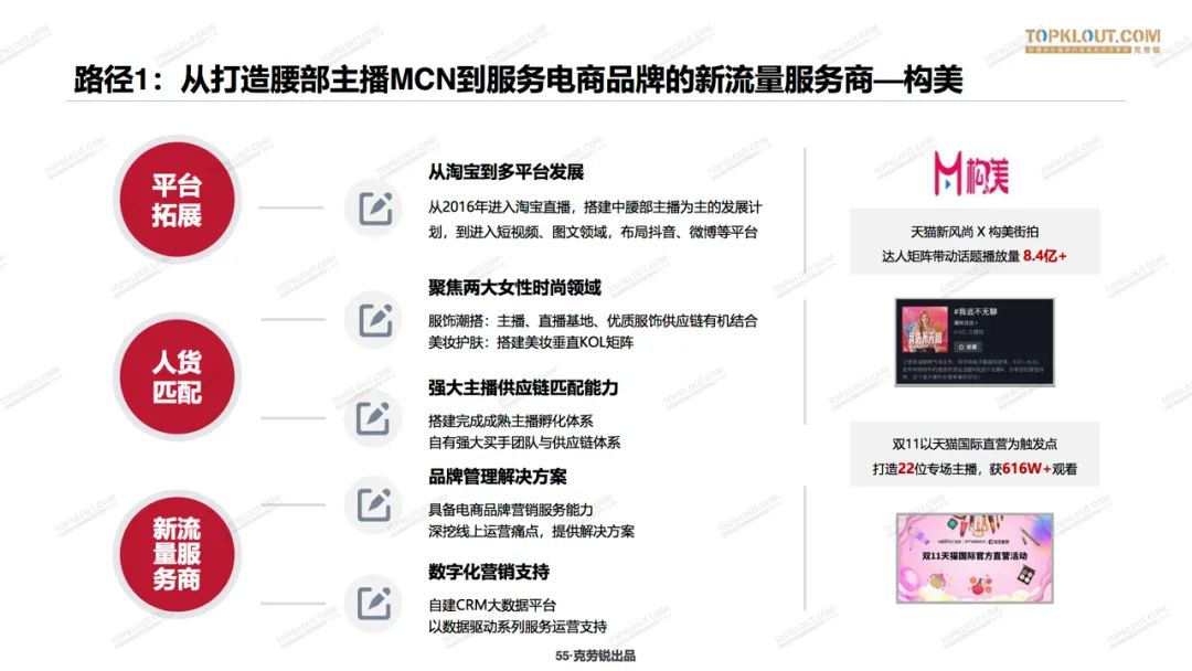尽管没有现象级的头部红人,但积累了大量中腰部KOL的构美,定位自己为电商品牌的「新流量服务商」。他们通过淘宝主播和站外达人获得平台流量,再为不同的商品找流量出口。因为早期入局,粉丝基础和流量渠道稳定,能将货物精准分配给主播并触达用户。这套运作方式很像一个「线上总经销」。