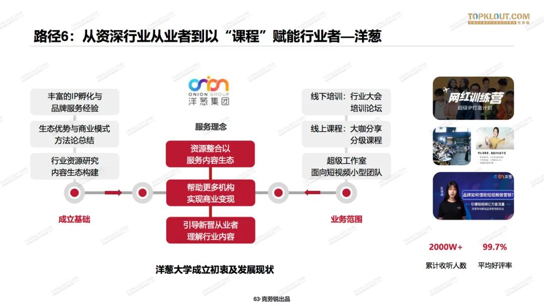 孵化了办公室小野、代古拉k的洋葱视频,现在有一块重要业务是以培训课程赋能行业。通过对个体网红孵化到方法论的总结,洋葱通过一套商业模式的建构样板让更多机构落地变现。