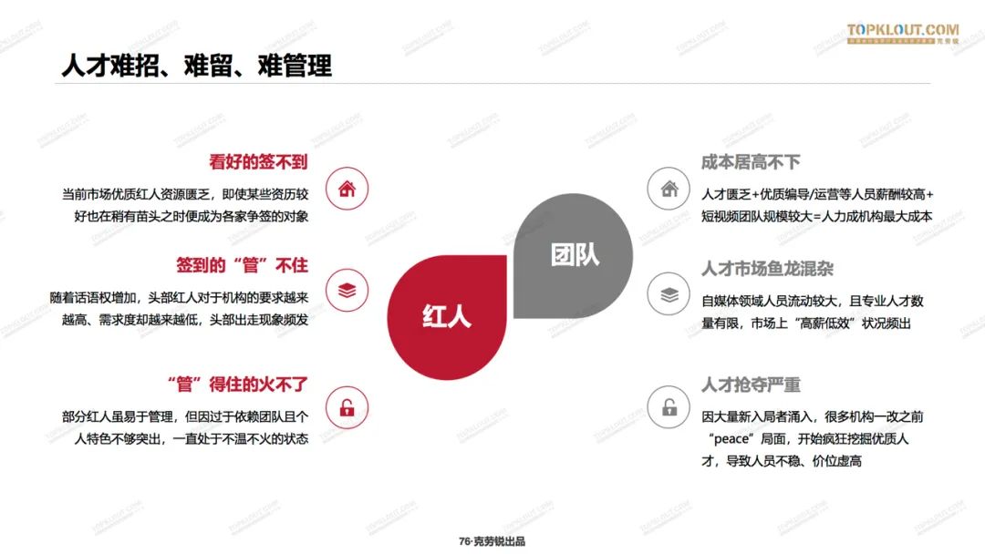 这些突发状况都暴露了行业内利益分配不均、人才培养和管理体系的混乱。克劳锐这份报告,走访了多家MCN机构,他们都谈及,红人和团队都存在难招、难留、难管理的问题。