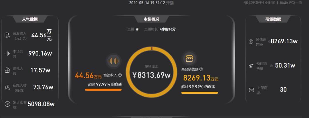 而从结果来看,陈赫并没有愧对这波激情打call。从零食、马桶盖到面膜、旅游产品,这场持续4小时的直播中,陈赫共推荐商品30件。截止至发稿,根据新抖数据,该场直播交易额超8200万元,累计观看人数超过5000万,音浪收入为 990万元。