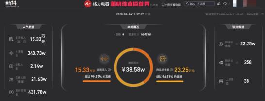 38件商品,最终只卖出了23.25万的销售额。对比当天同样在抖音直播带货的罗永浩,总销售额是5000多万。