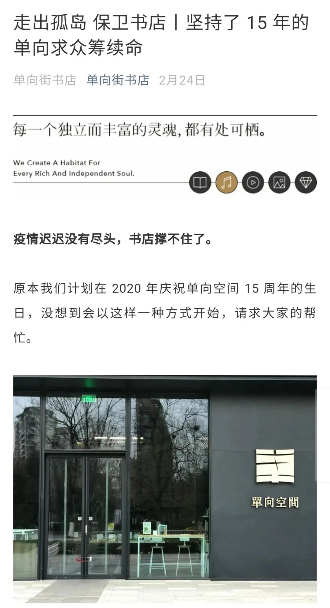 “疫情迟迟没有尽头,书店撑不住了。”2月24日,许知远在单向街书店微信公众号发布求助信时,写下了这样的话。