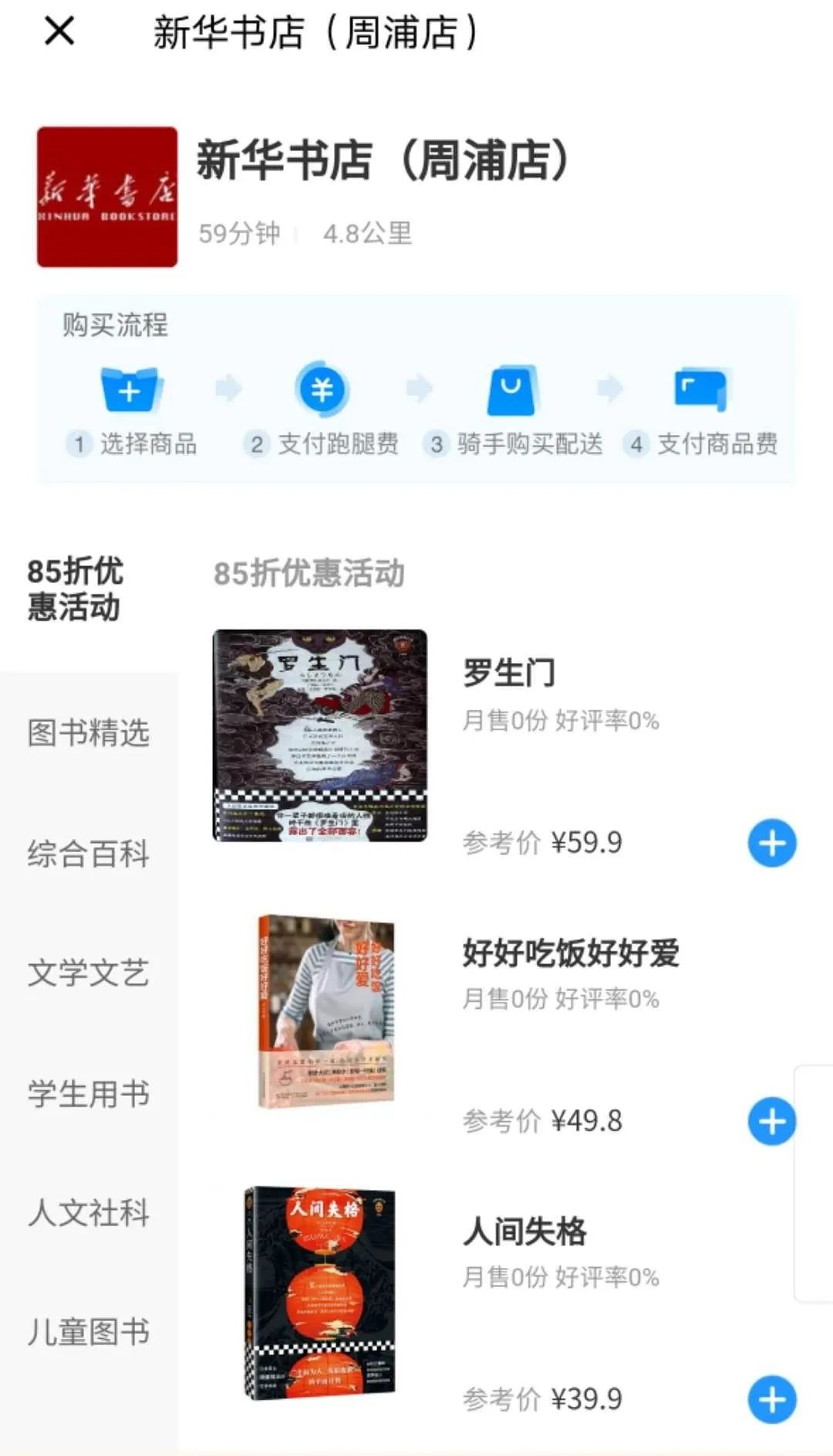这意味着,在上海地区,用户只要打开饿了么,搜索“新华书店”或者“上海书城”,就会显示离消费者最近的门店,随后,用户只需要像点一份外卖一样,选择想要的书并下单,最快半个小时,骑手就会把书送到消费者手上。