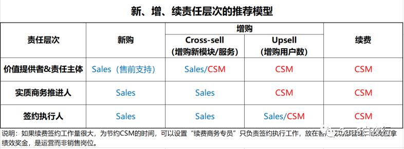 ◆ 实质商务推进人:价值提供者未必适合或未必有能力推进新、增、续的实质商务工作,例如推动客户企业内部决策流程、谈价格及折扣等等。对Cross-Sell来说,因为要向客户推荐新模块(或新产品和服务),需要推进客户内的决策流程,更适合Sales操作;而对续费工作来说,因为是按原合同的主要条款续费,CSM能够独立操作(当然,这也与产品复杂程度及客户规模有关,下文有进一步描述)。